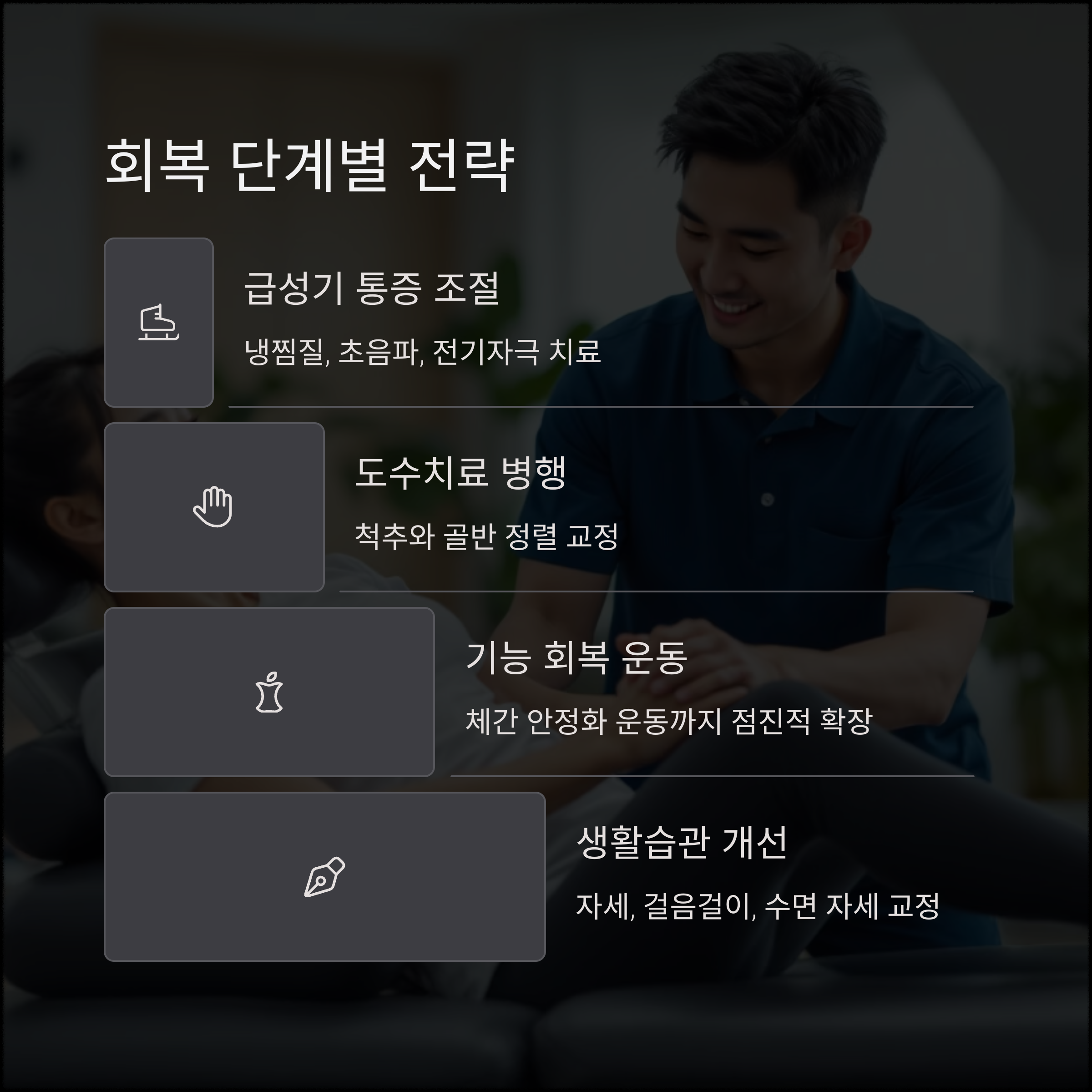 핵심은 체계적인 진단 후, 1단계(통증 조절) → 2단계(관절 정렬 교정) → 3단계(재활 및 운동 습관화)