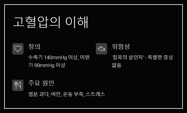 - 비만: 체질량지수(BMI)가 25 이상인 경우 고혈압 위험이 크게 증가합니다.