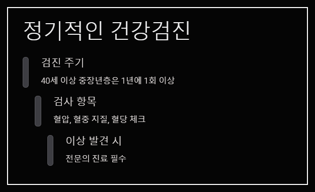 - 정기 검진: 혈압, 콜레스테롤 정기적 체크