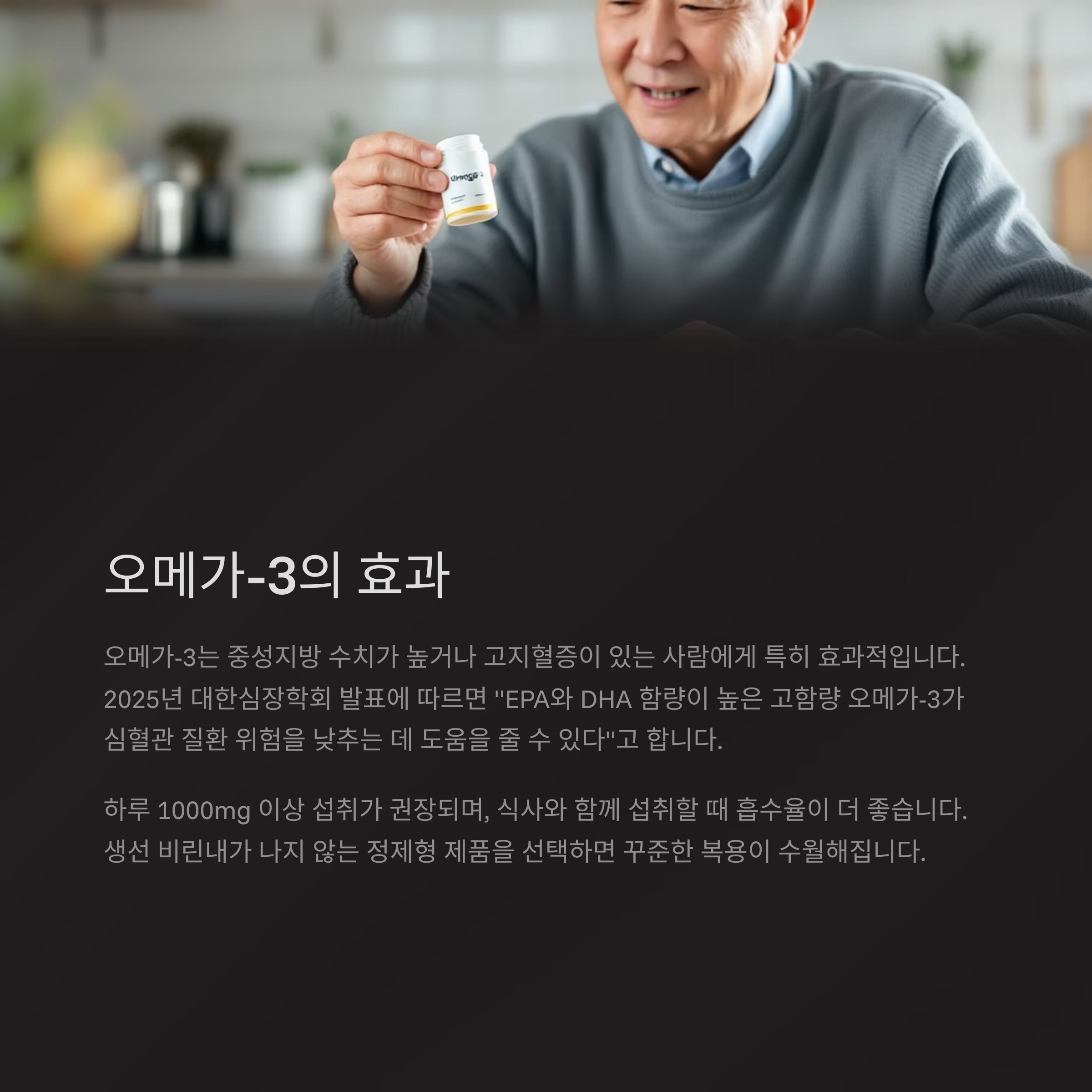 오메가-3는 특히 중성지방 수치가 높거나 고지혈증이 있는 사람에게 효과적인 성분입니다. 최근 2025년 대한심장학회 발표에서는 "EPA와 DHA 함량이 높은 고함량 오메가-3가 심혈관 질환 위험을 낮추는 데 도움을 줄 수 있다"고 밝혔습니다.