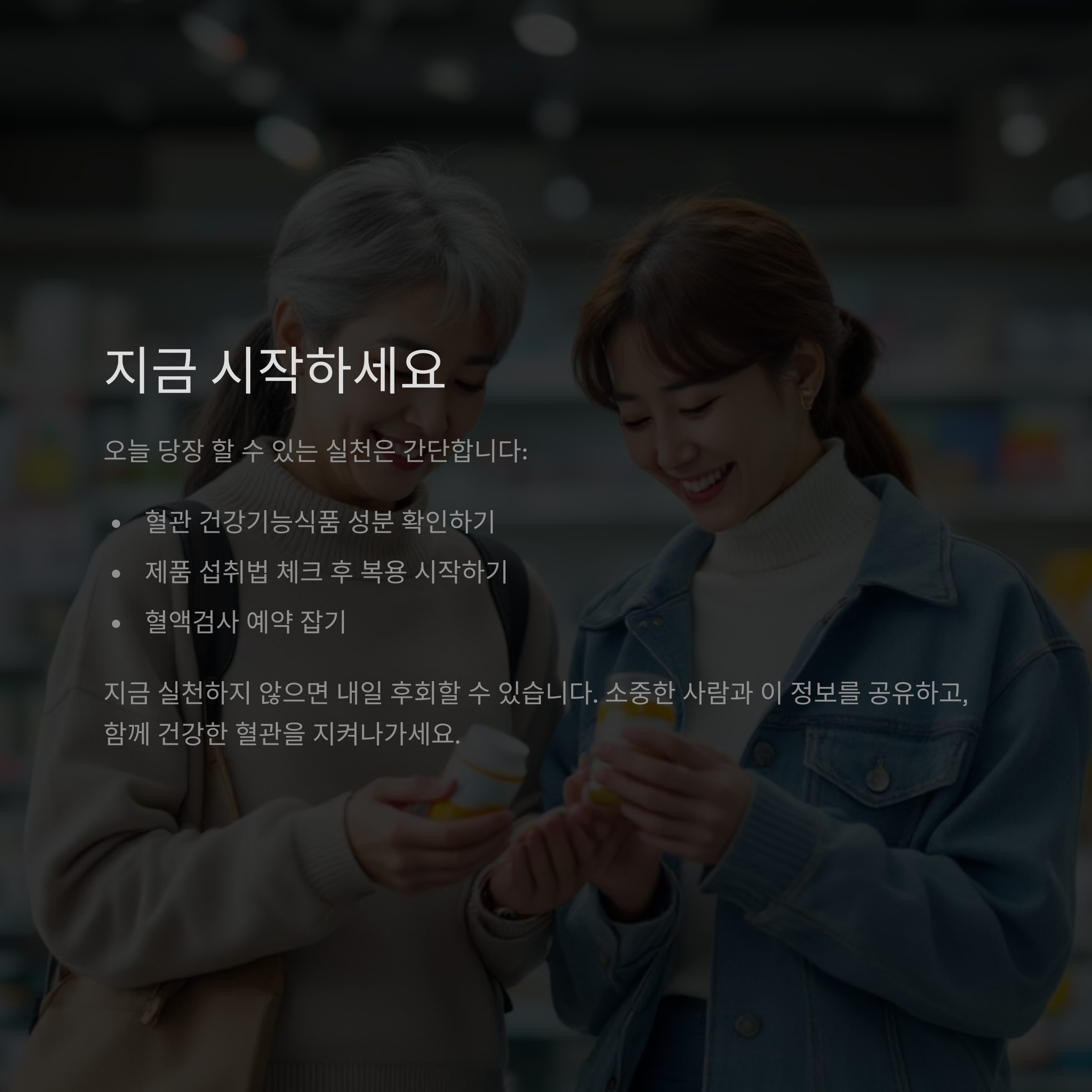 지금 실천하지 않으면 내일 후회할 수 있습니다. 내 몸이 보내는 신호를 무시하지 마세요. 혈관은 '조용한 살인자'에게 가장 먼저 공격받는 기관입니다. 지금 움직이세요.