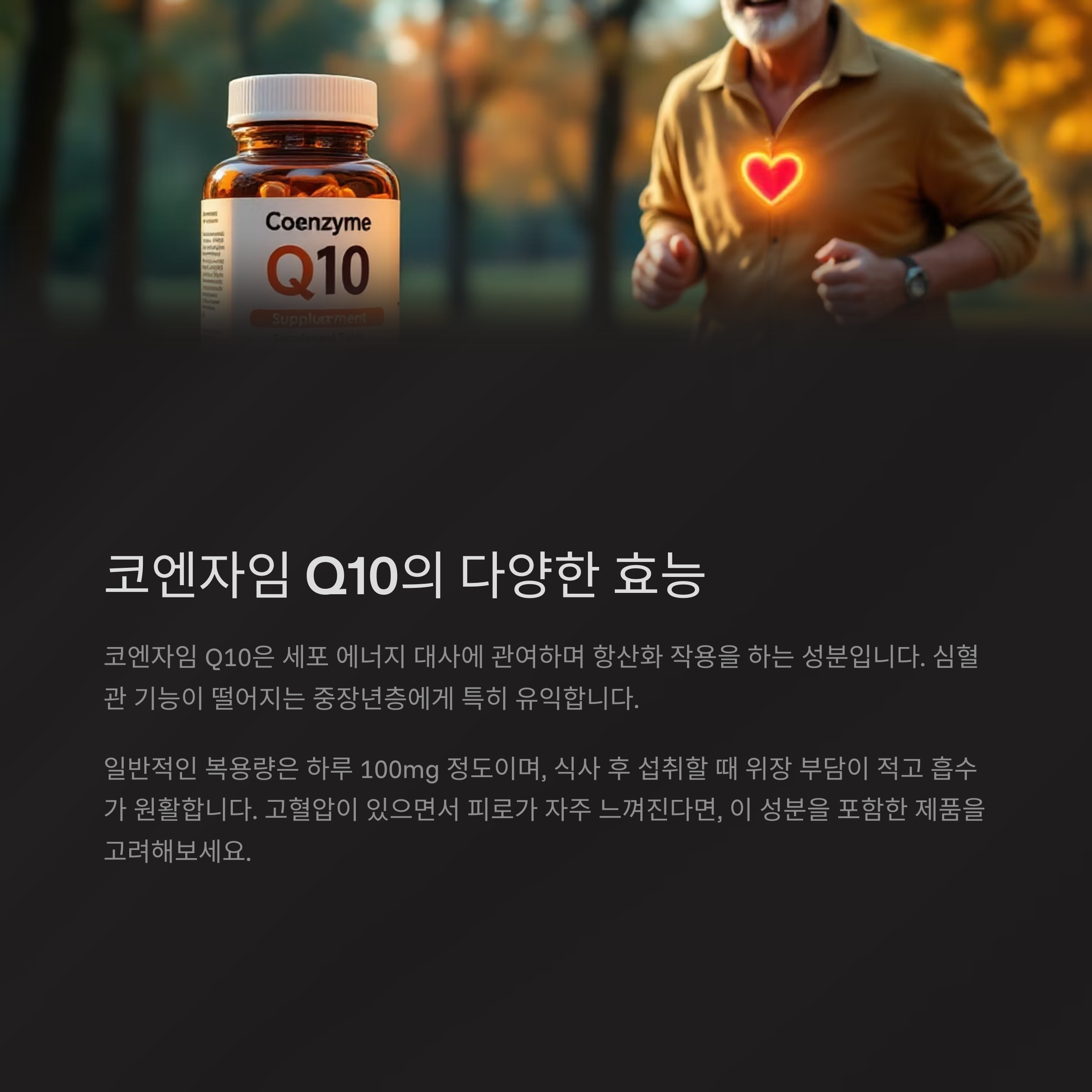 코엔자임 Q10은 세포 에너지 대사에 관여하며 항산화 작용을 하는 성분입니다. 심혈관 기능이 떨어지는 중장년층에게 특히 유익합니다.