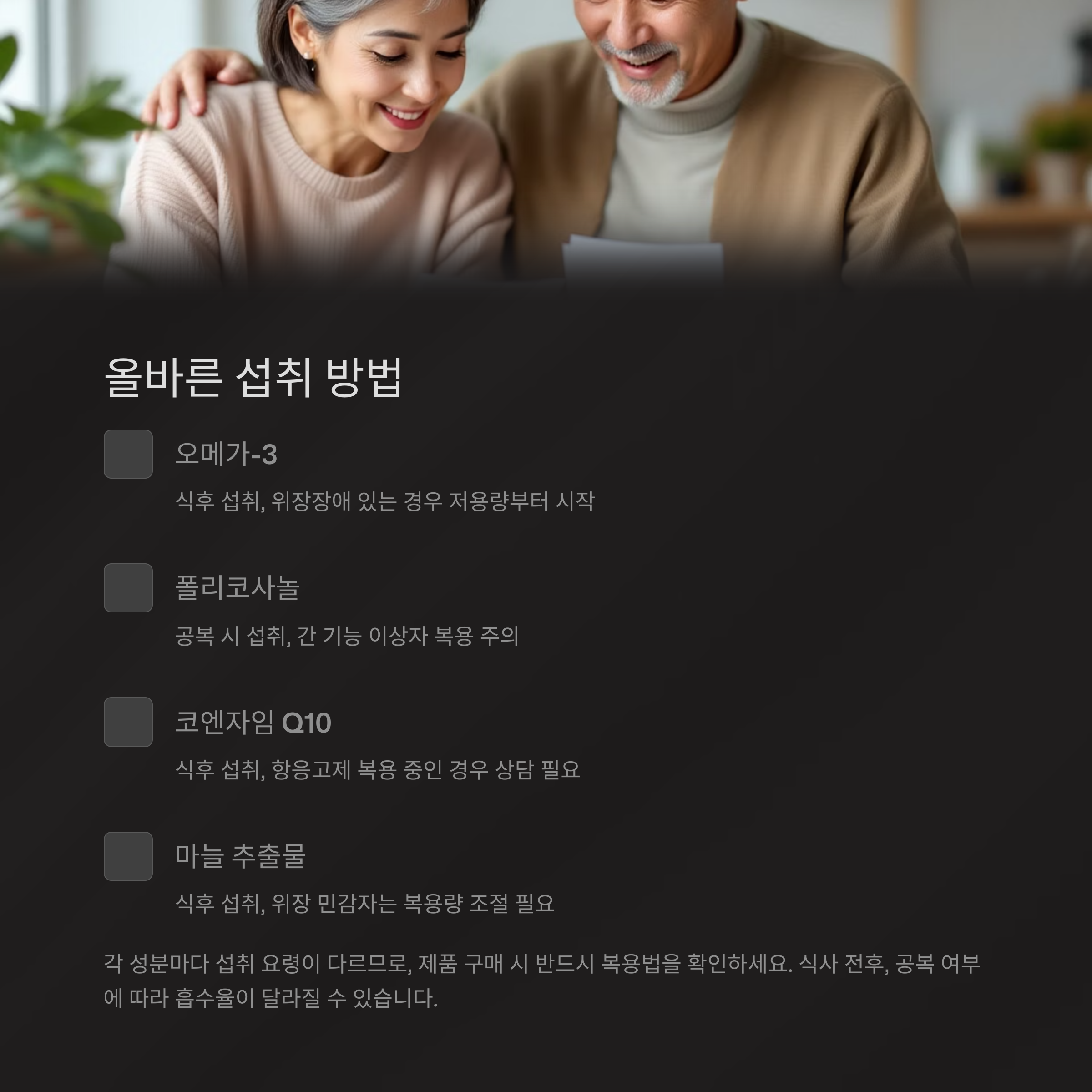 복용 방법이 잘못되면 아무리 좋은 성분도 효과를 보기 어렵습니다. 아래 표는 주요 성분별 섭취 팁을 정리한 것입니다.