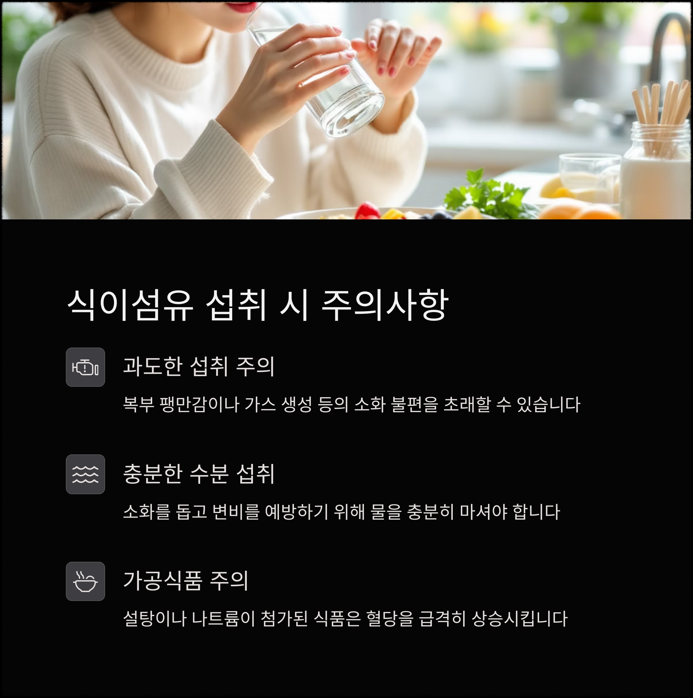 - 수분 섭취: 식이섬유 섭취 시 충분한 수분을 함께 섭취하여 소화를 돕고 변비를 예방해야 합니다.