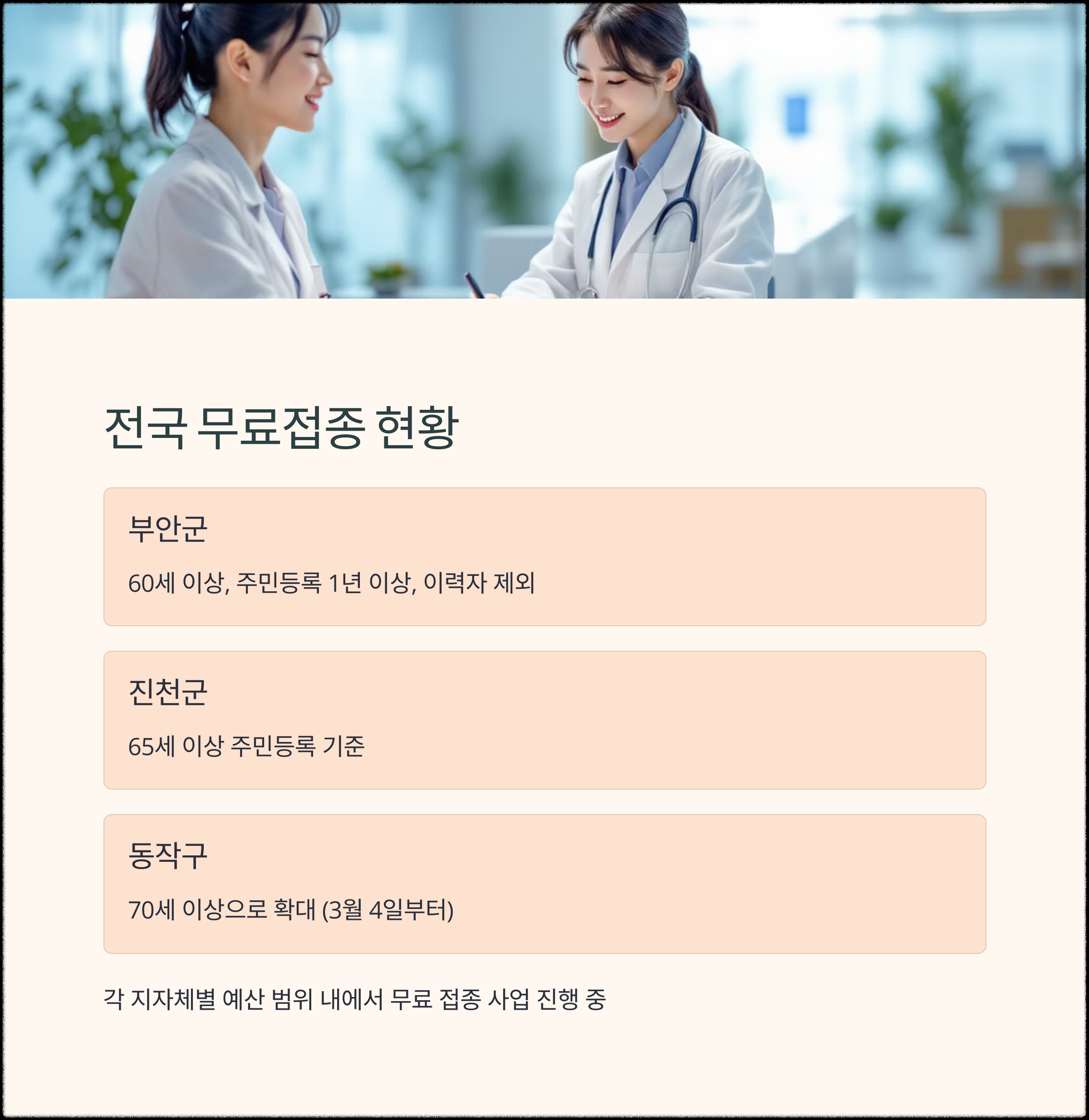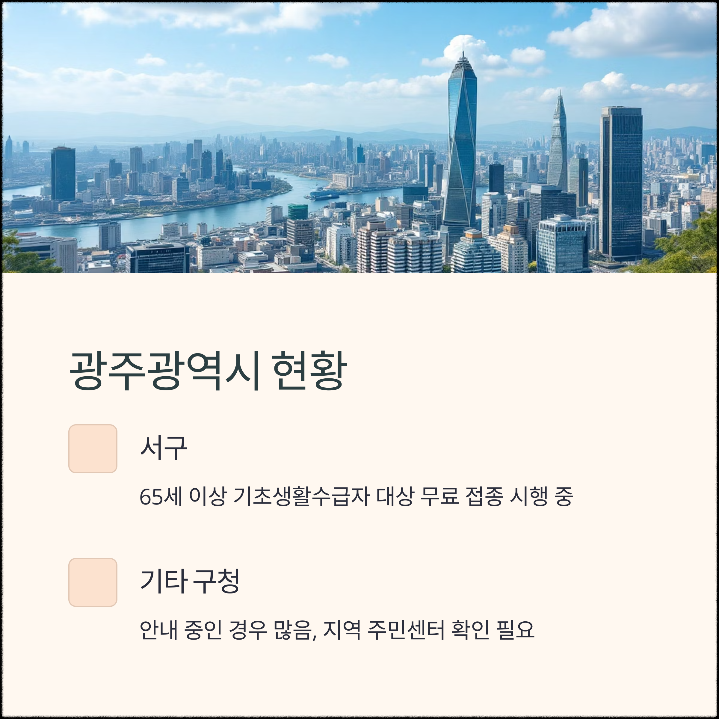 광주광역시는 아직 광주 서구 등 일부 자치구 중심으로 65세 이상 기초생활수급자 대상 무료 접종 사업이 확인됩니다.